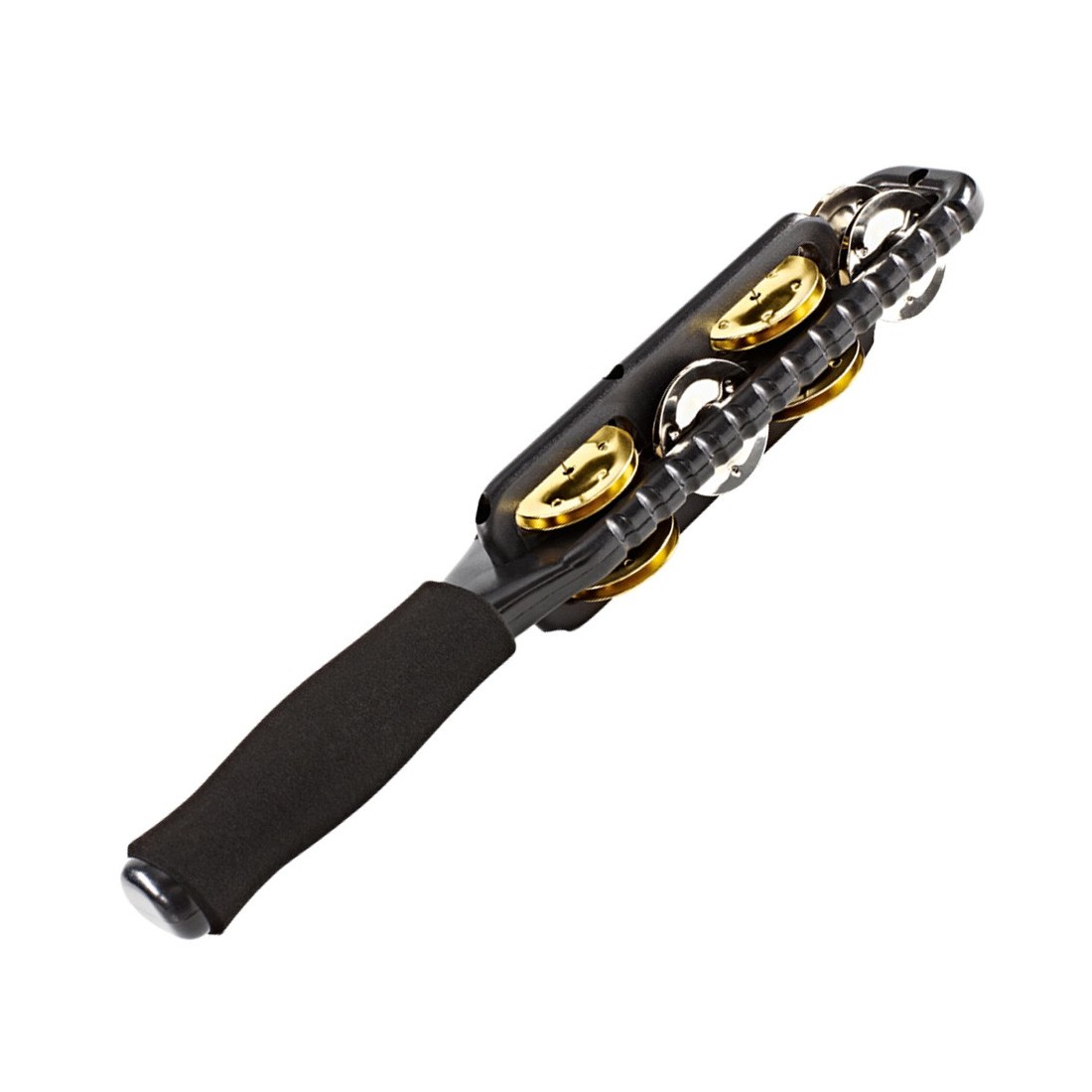 Multi Jingle Stick, cymbalettes laiton et acier montées sur deux plans, grip gainé mousse, bords crantés pour jouer du guiro.