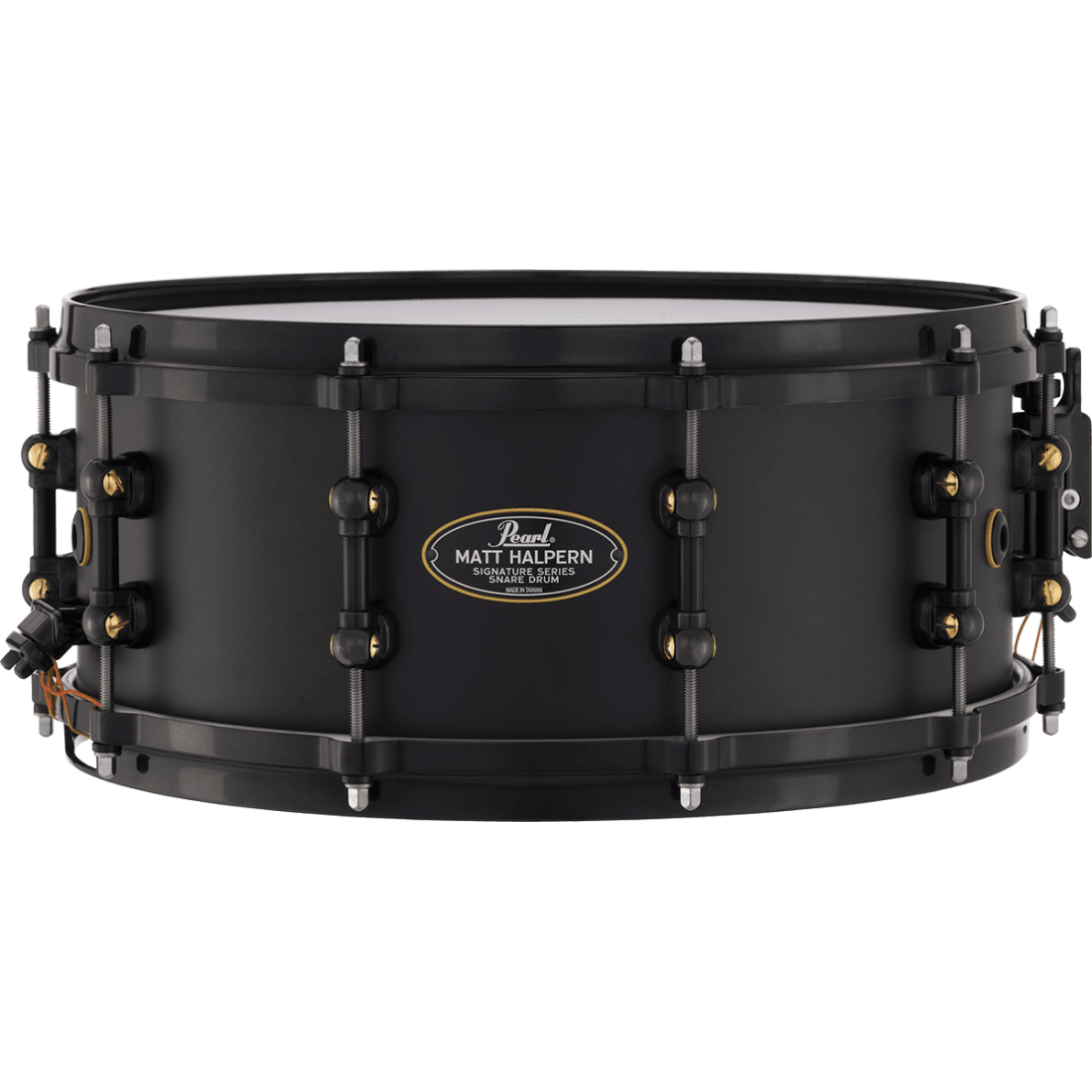Caisse claire signature Matt Halpern du groupe Periphery L'artiste Pearl Matt Halpern a conçu chaque élément de sa caisse claire signature pour compléter - et aussi pour contraster - la nature sophistiquée de son jeu. Des touches subtiles, comme le revêtement en poudre noir et les trois évents de la caisse claire, permettent de tempérer le son vif de sa caisse en laiton de 1,5 mm. Les cercles moulés MasterCast die-cast renforcent la projection, mais les peaux apportent un son et une attaque contrôlés. "J'ai voulu optimiser cette caisse claire en me basant sur mes expériences précédentes de développement d'une caisse claire signature, pour en faire quelque chose qui place la barre encore plus haut en termes de confort, de qualité et de son. Honnêtement, je ne pourrais pas être plus heureux du résultat !" -Matt Halpern Du hardware haut de gamme Son timbre SR-150 Click-Lock offre une sensibilité accrue, tandis que des touches visuelles telles que les coquilles STL Swivel noir/laiton et les garnitures jaunes frappantes, servent à inspirer la meilleure qualité de jeu. Le résultat final est une caisse claire avec une versatilité sèche et tranchante, qui répond rapidement pour un jeu énergique, et sert une variété de styles avec une gamme d'accord large. Coquilles black Swivel Tube Les coquilles STL uniques de Pearl permettent d'augmenter la résonance, de minimiser le contact avec le fût et d'aligner précisément l'accordage. Trois évents moulés sous pression La disposition des évents dans le fût en laiton prend une forme triangulaire pour une meilleure évacuation de l'air et une tonalité plus sèche. Cercles MasterCast Un anneau moulé sous pression solide et fiable pour augmenter le volume, l'attaque et le contrôle des harmoniques. Revêtement en poudre noir brillant.