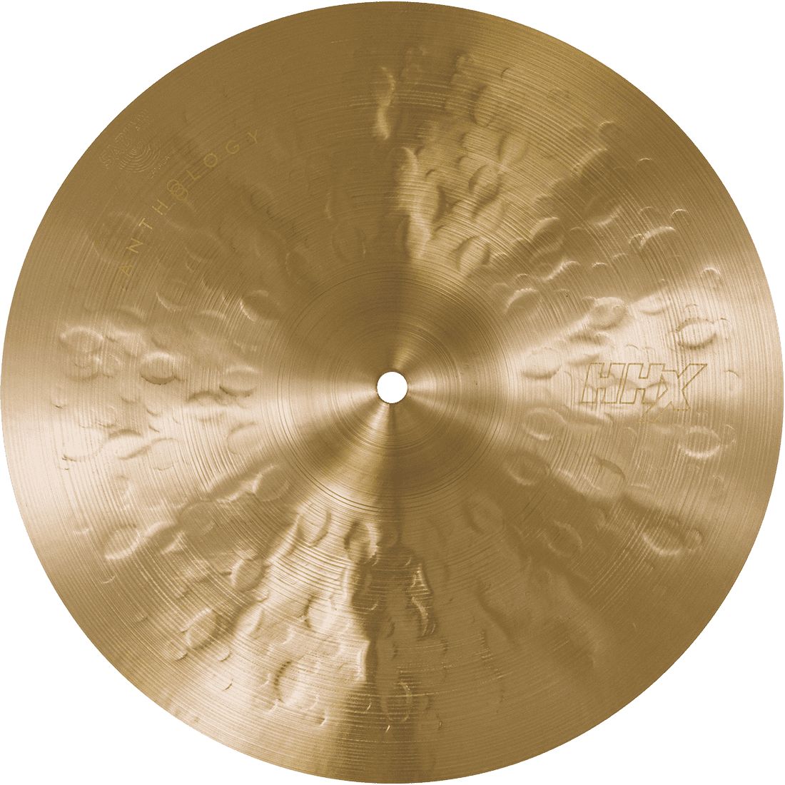 The Anthology logo and HHX have lighter outlines, in gold ink, on the hammered portion. The hammered bronze creates a subtle tone-on-tone effect that gives the cymbal a sense of understated, minimalist luxury.