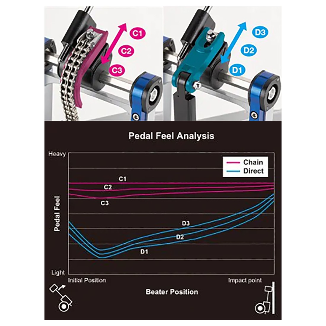 • Direct Drive (FP9D,DFP9D) : The direct drive creates a direct link between the footboard and the beater, conveying the movement of the drummer's foot to the beater instantaneously. The link can be slid into three positions,allowing the drummer to fine tune the pedal's action to match their preferred performance.